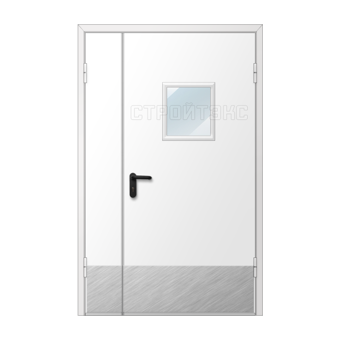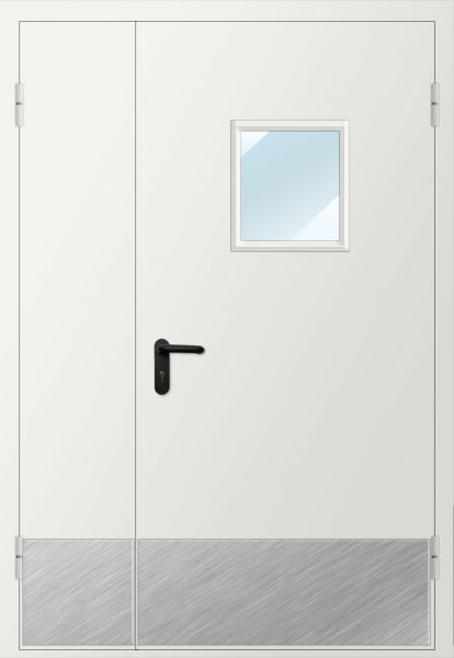 Дверь двупольная металлическая противопожарная с остеклением изготавливается по индивидуальным размерам на нашем собственном производстве. Полотно и рама двери выполнена из металла 1,2 или 1,4 мм. Цвет двери может быть абсолютно любой по шкале RAL, используем порошковое напыление. Качественная упаковка обеспечит доставку в другой регион без рисков. Срок изготовления в среднем занимает 7 дней.