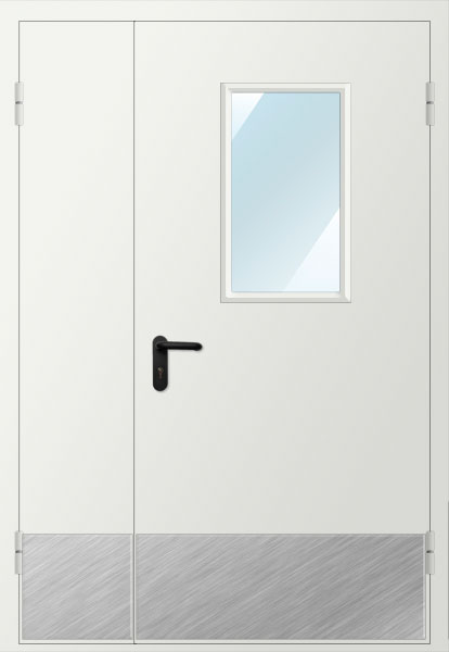 Дверь двупольная металлическая противопожарная с остеклением изготавливается по индивидуальным размерам на нашем собственном производстве. Полотно и рама двери выполнена из металла 1,2 или 1,4 мм. Цвет двери может быть абсолютно любой по шкале RAL, используем порошковое напыление. Качественная упаковка обеспечит доставку в другой регион без рисков. Срок изготовления в среднем занимает 7 дней.