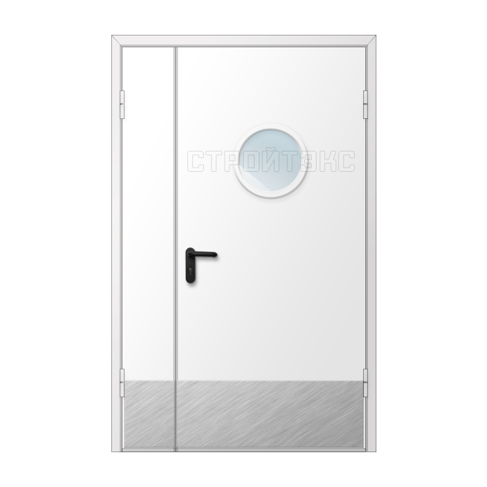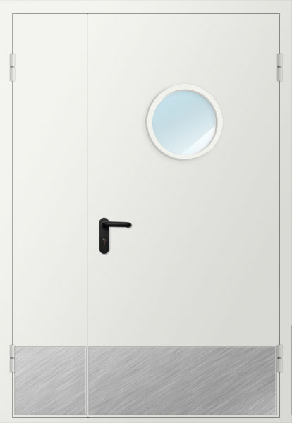 Дверь двупольная металлическая противопожарная с остеклением изготавливается по индивидуальным размерам на нашем собственном производстве. Полотно и рама двери выполнена из металла 1,2 или 1,4 мм. Цвет двери может быть абсолютно любой по шкале RAL, используем порошковое напыление. Качественная упаковка обеспечит доставку в другой регион без рисков. Срок изготовления в среднем занимает 7 дней.