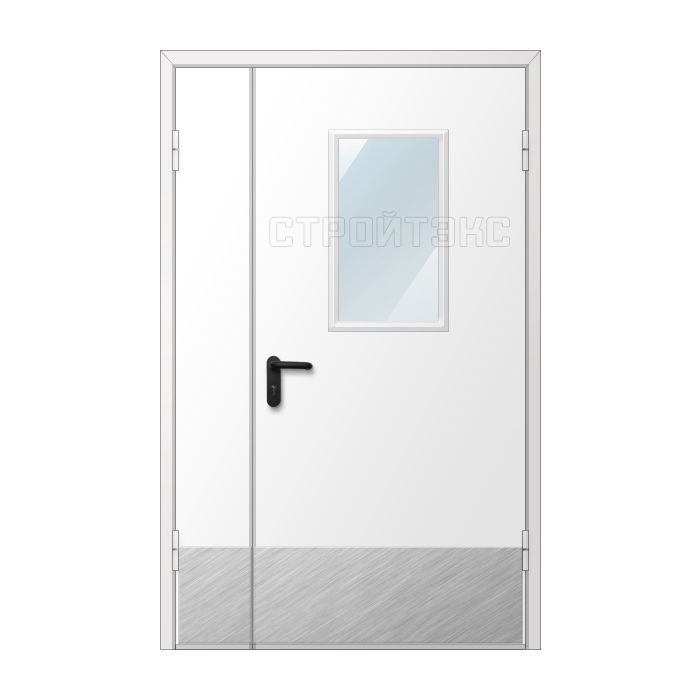 Дверь двупольная металлическая с накладкой из нержавеющей стали и остеклением 300х600